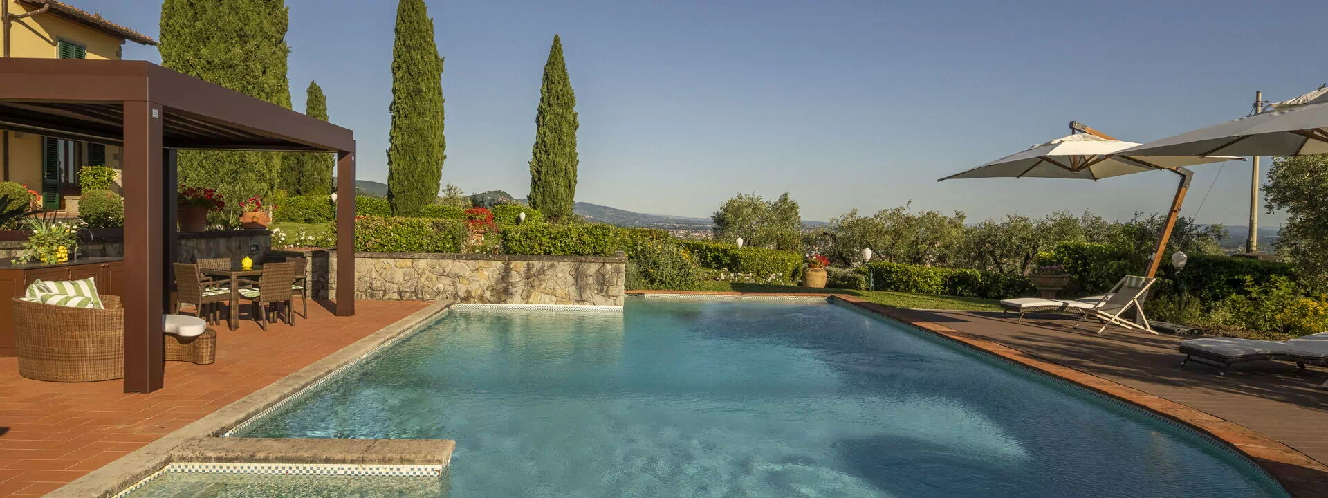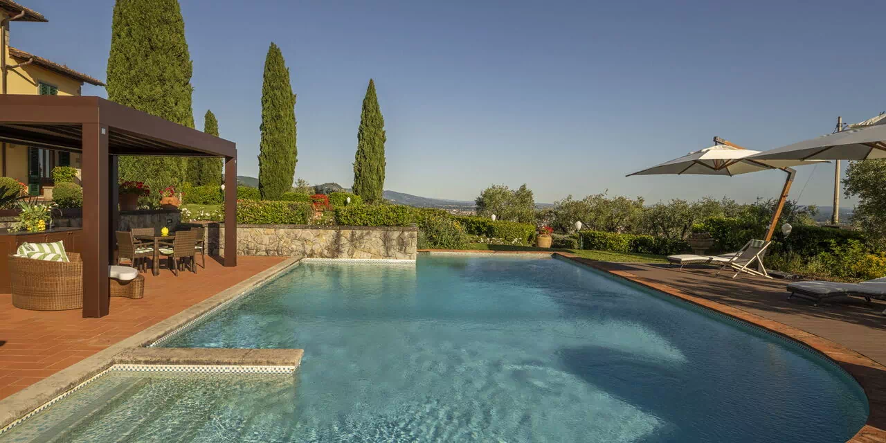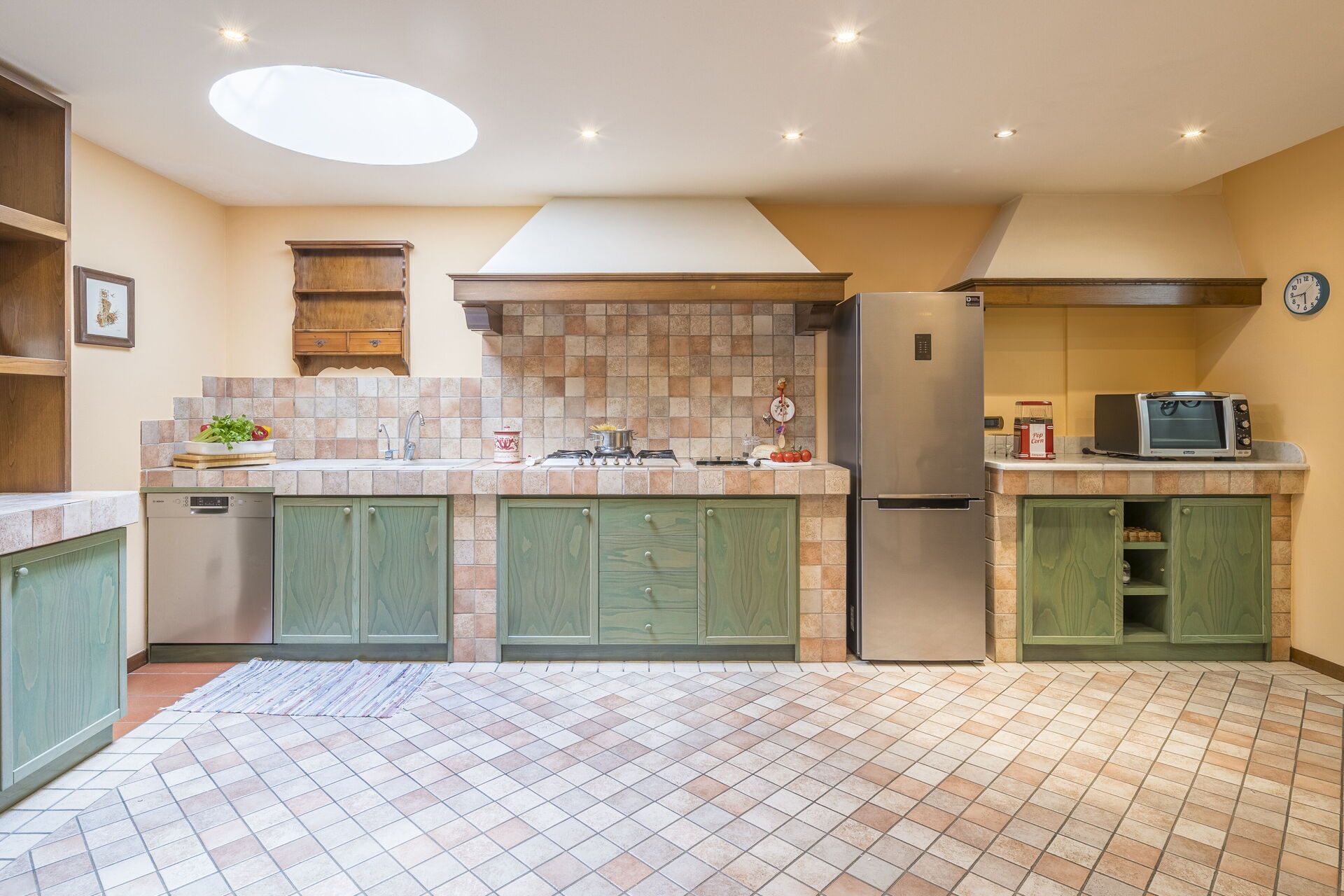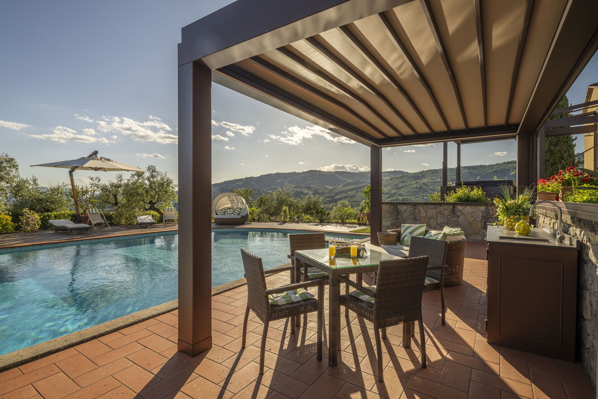 The outdoor spaces are surrounded by greenery, with manicured gardens to enjoy the panorama of the rural landscapes of the Valdinievole. The beautiful fenced park surrounding the house is full of hedges marking the boundary to safeguard your privacy and the characteristic olive trees, a symbol par excellence of Tuscany. The well-kept lawn is trimmed in English style and offers natural shady areas and lush scented vegetation such as roses, oleanders and aromatic plants. The outdoor dining area is equipped with a brick barbecue and a wood-burning oven.