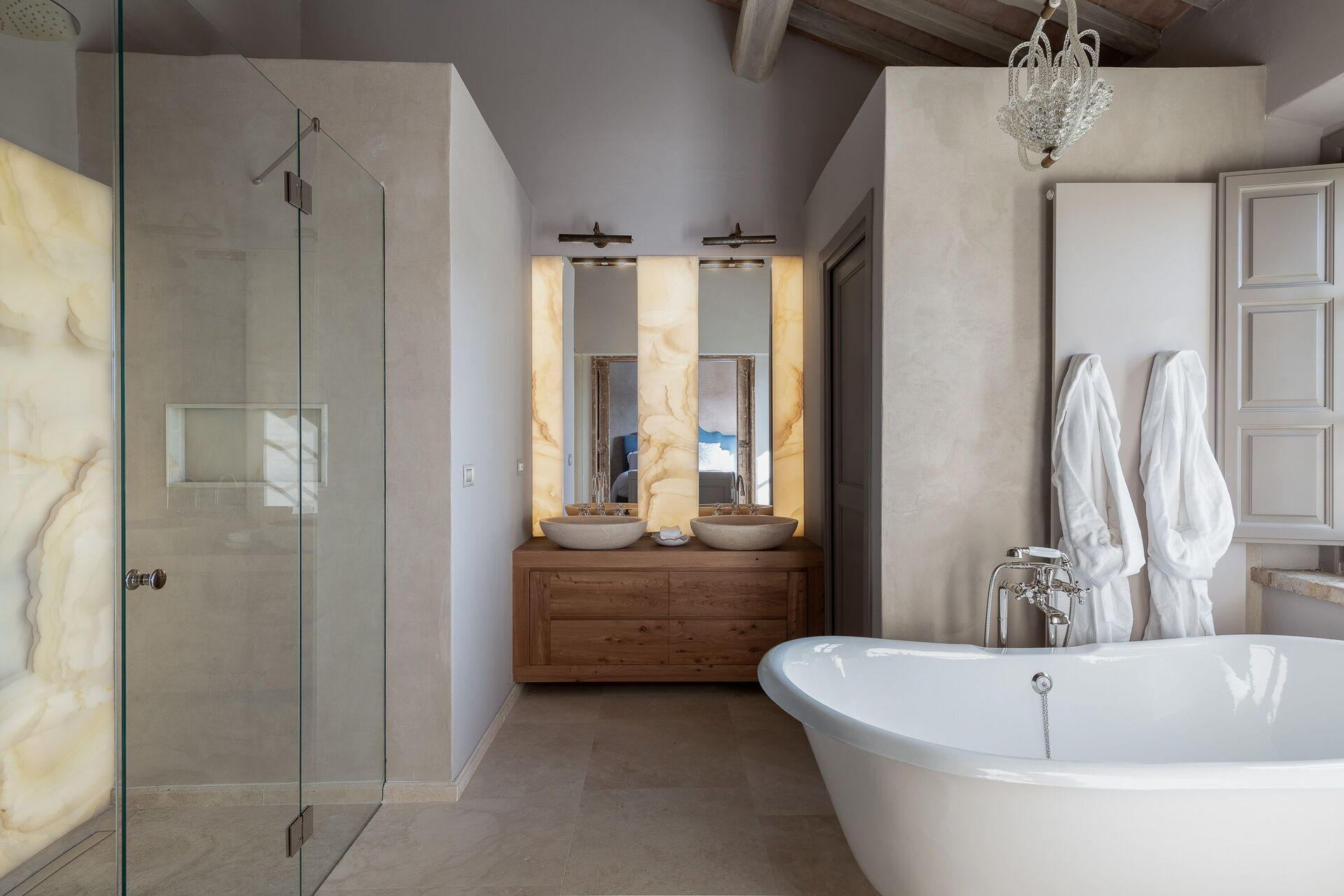 The main villa has six double rooms with king-size beds and en-suite bathrooms with luxurious baths and a twin room located in the turret offering a 360-degree panorama and spectacular sunset views.