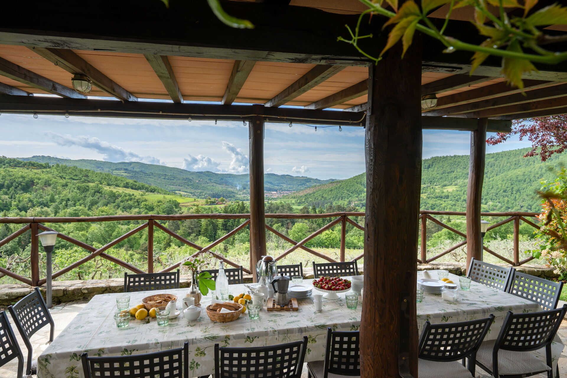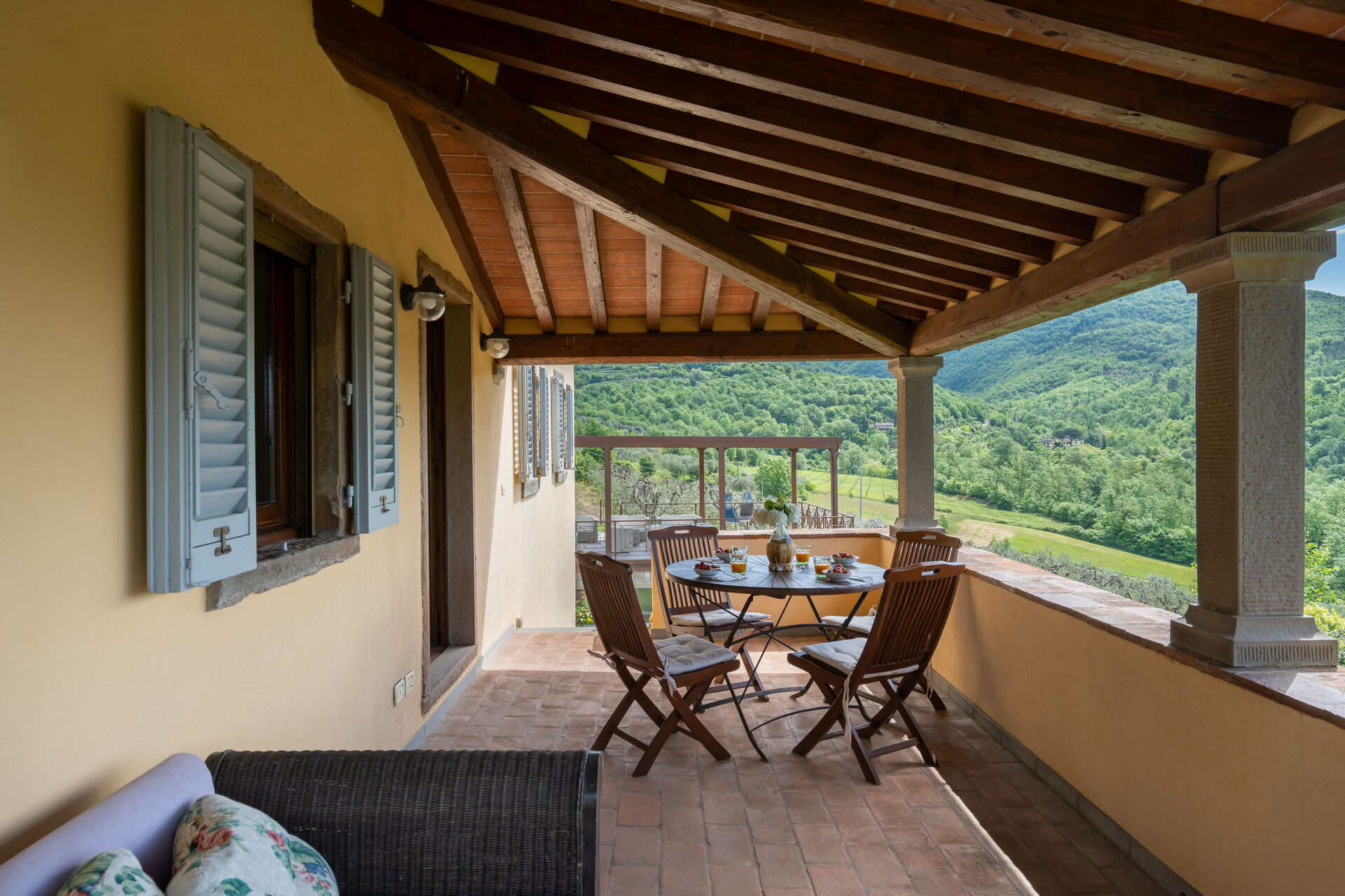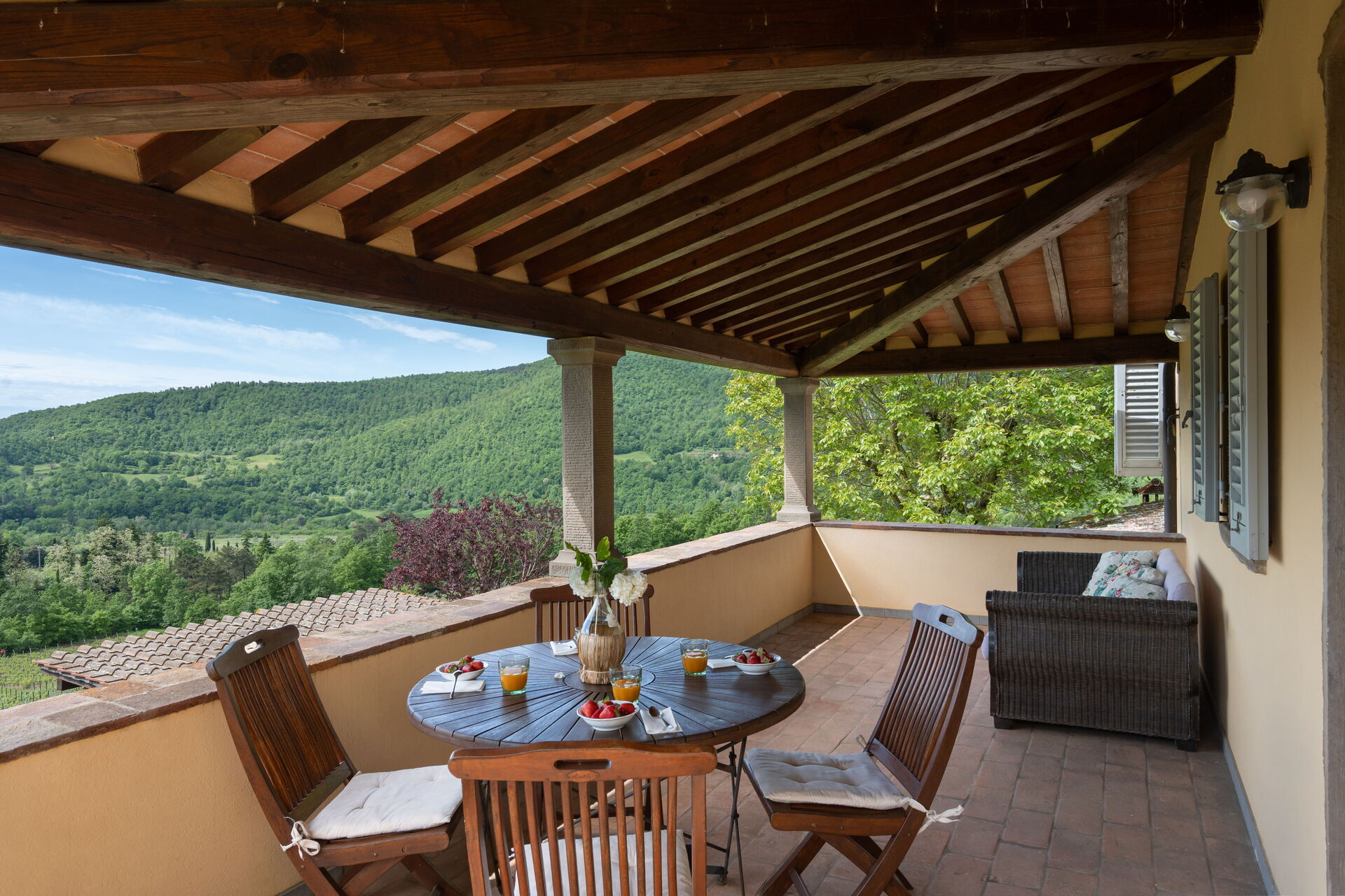 The property is located only 15 minutes by car from the ancient city of Arezzo, on the edge of the Casentino Forests and the Verna Park. A tennis court, shared with guests Villa Olivi and Vogognano, is also within walking distance (about 200 m). The covered terrace with pizza oven, the panoramic veranda and the terrace on the first floor allow guests to admire the splendid panorama and spend pleasant moments outdoors. The location is so charming that many couples choose it to celebrate their unforgettable wedding in Tuscany! On request, the owner organises dinners, lunches and cooking classes (to be paid for locally). The windows are fitted with mosquito nets. Two baby cots are also available on request. Excursion tips: 4 km Subbiano, 35 km Caprese Michelangelo, 48 km Cortona, 70 km Florence, 15 km golf course.
